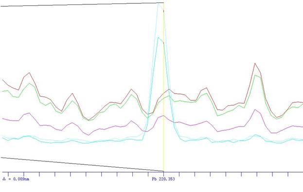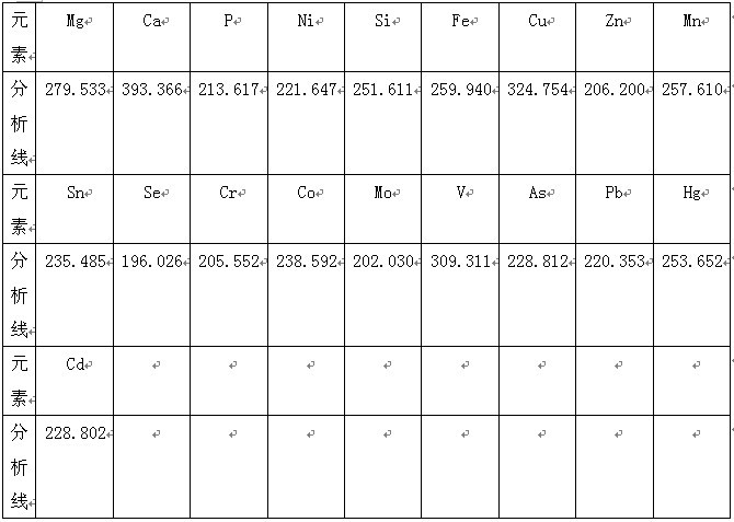 根據ICP軟件譜線庫提供所有元素不同譜線,首先選擇被測元素靈敏度高 的譜線,其次考慮不受樣品基體及被測元素相互之間干擾小的譜線的原則,選擇分析線如下。