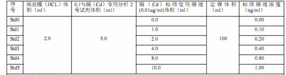 使用鎘(Cd)標準使用溶液(0.01ug/ml),優級純鹽酸(HCL) ,0.1%鎘(Cd)專用分析 2 號試劑,去離子水(電阻率≥10M歐姆)等試劑。