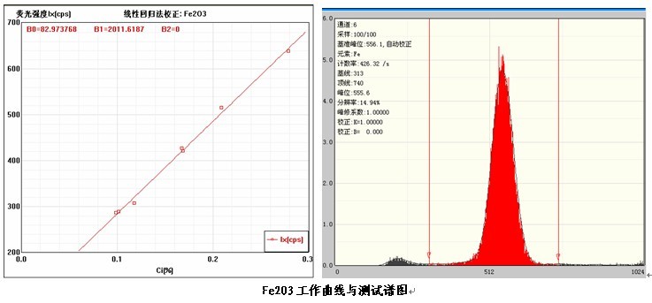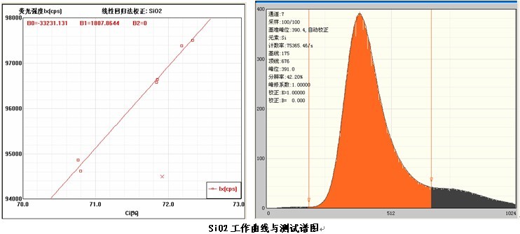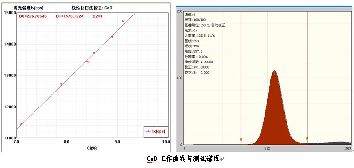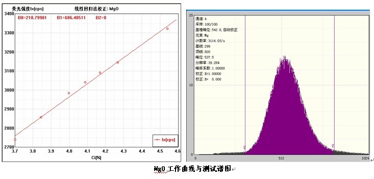 各個元素的工作曲線與測試譜圖,其中B0為曲線節距;B1:為曲線斜率;在測試譜圖中有元素的測試信息:計數率,采樣時間,分辨率等。