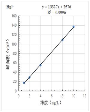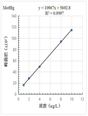 1.0μg/L、2.0.μg/L、4.0μg/L、8.0μg/L、10.0μg/L 汞形態混合標準溶液分離色圖譜如圖3所示,其中無機汞(Hg2+)、甲基汞(MetHg)、乙基汞(EtHg)相對保留時間分別為118s、185s、379s,從譜圖疊加圖上可以看出,三種汞形態出峰時間穩定,且分離度較好。