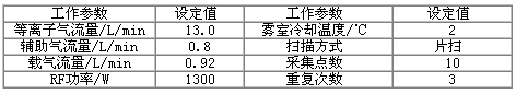 以10.0ng/mL Li 、Co 、In 、Ce 、U 和Bi混合調諧液優化儀器工作參數,使儀器靈敏度最佳,同時確保氧化物及雙電荷產率低于3%,具體工作參數見表1。在儀器最佳工作參數條件下,以內標法進行測試。