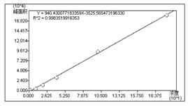 準確吸取濃度為10ug/mL的甜蜜素標準溶液10ul于50ml離心管中對應衍生物濃度分別為2ug/mL、10ug/mL、20ug/mL、100ug/mL、200ug/mL,按照上述標樣衍生化步驟進行衍生化,進行線性測試。實驗所得線性方程為:y=940.43x-3525.57,線性相關系數為0.9984,如圖5所示。
